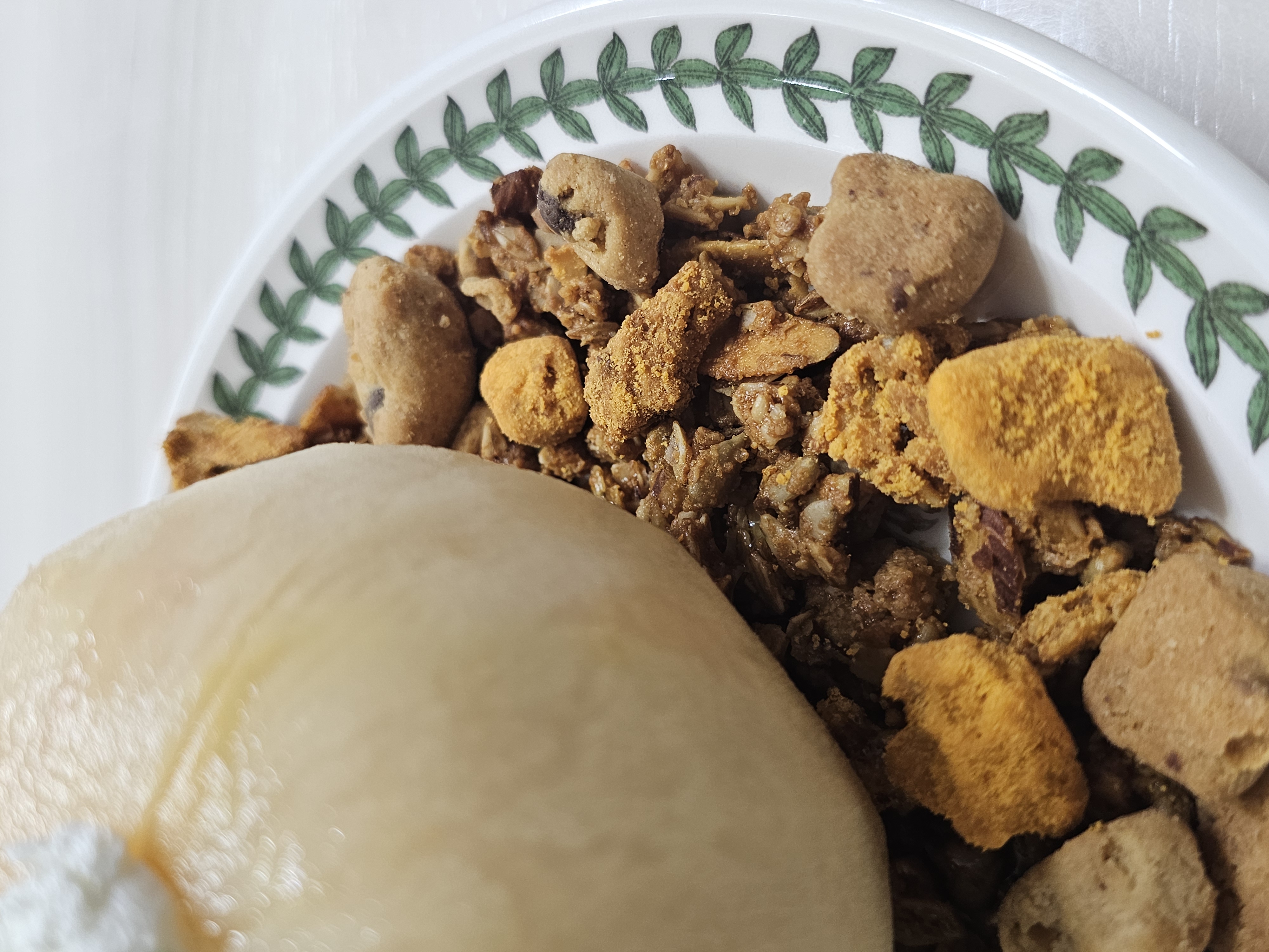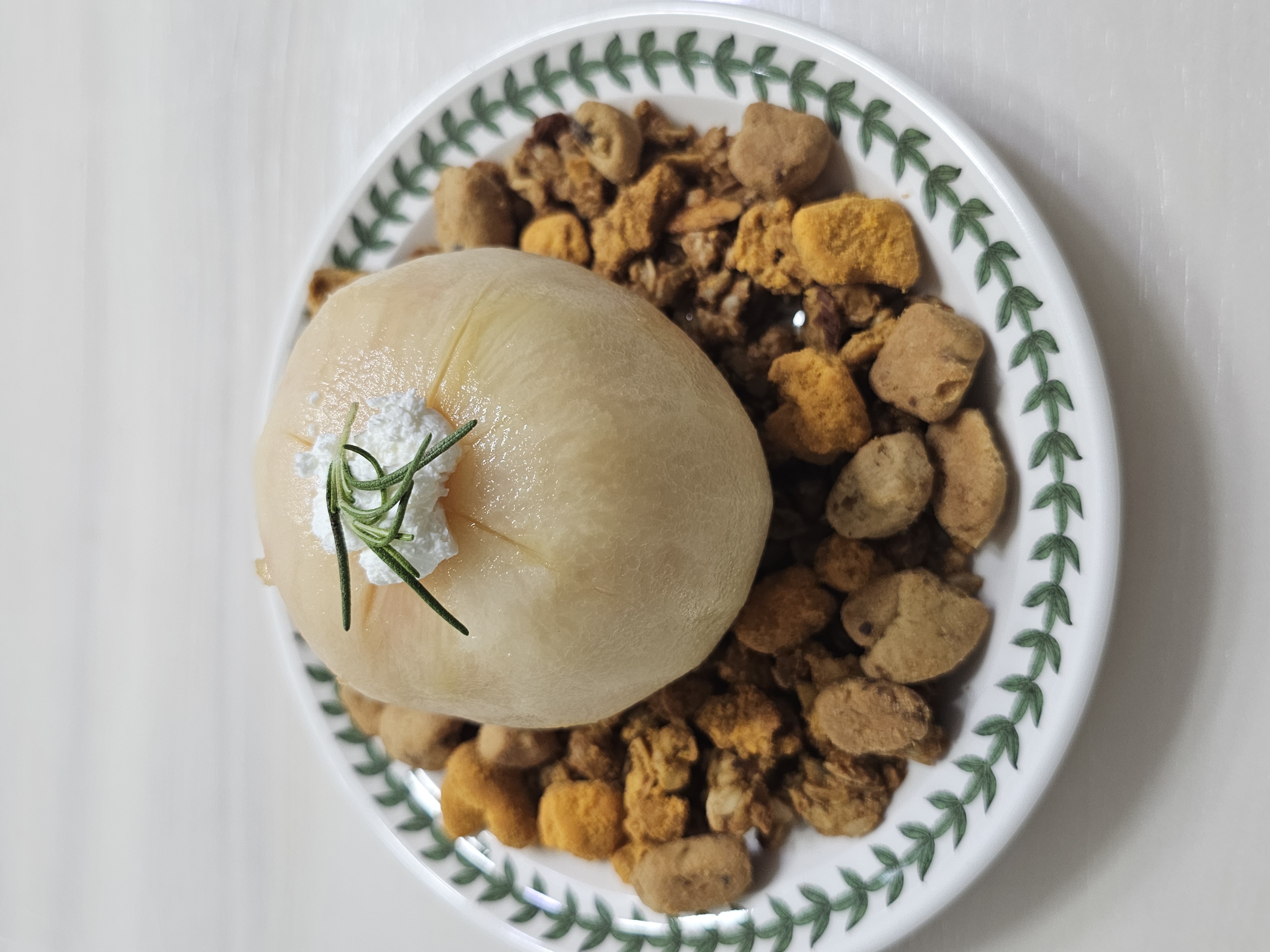 - 접시에 룩트(lukt) 그래놀라를 넓게 펼쳐줬어요. 황치즈 소보로, 크럼블 등 3종을 섞어서 듬뿍 깔아줬습니다. 그래놀라를 주변으로 올려주면 식감도 살고 영양도 UP!